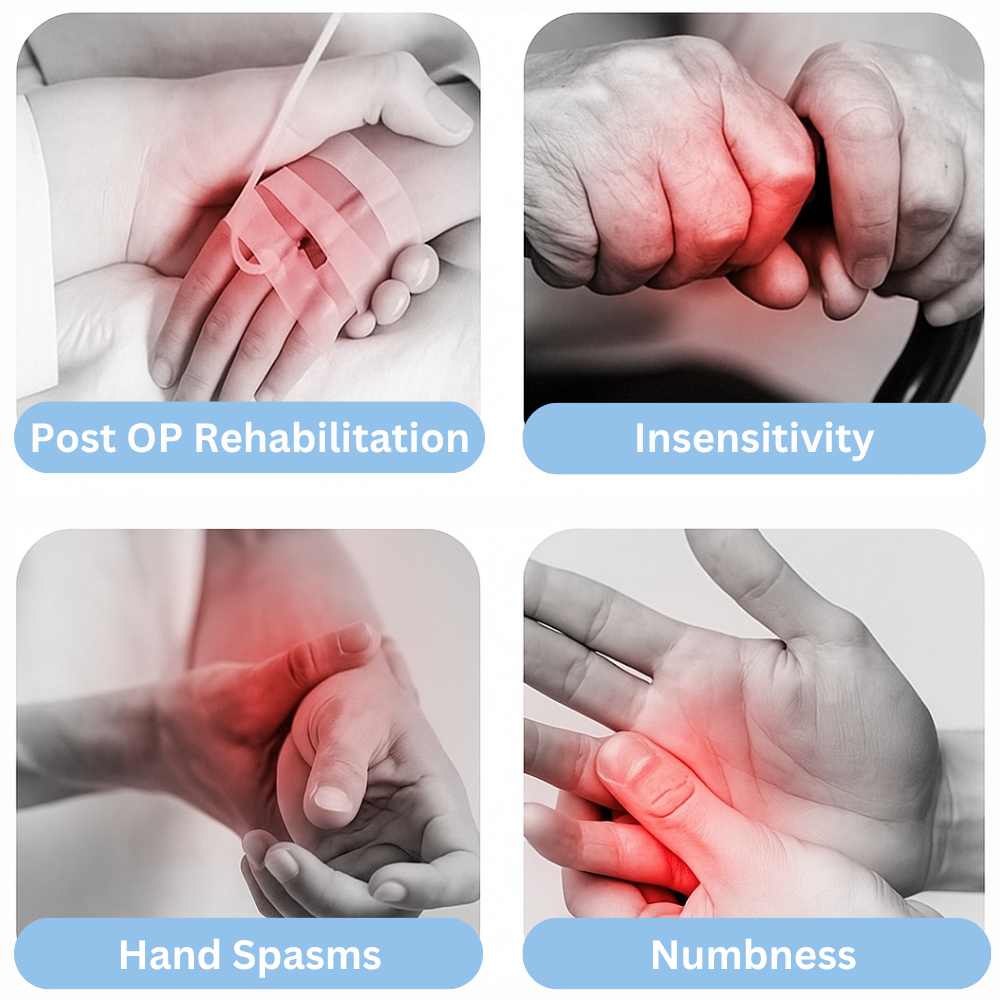 Designed for patients in the post-operative phase or those experiencing hand weakness, reduced sensation, or limited mobility, it provides a simple, comfortable tool for daily rehabilitation at home.